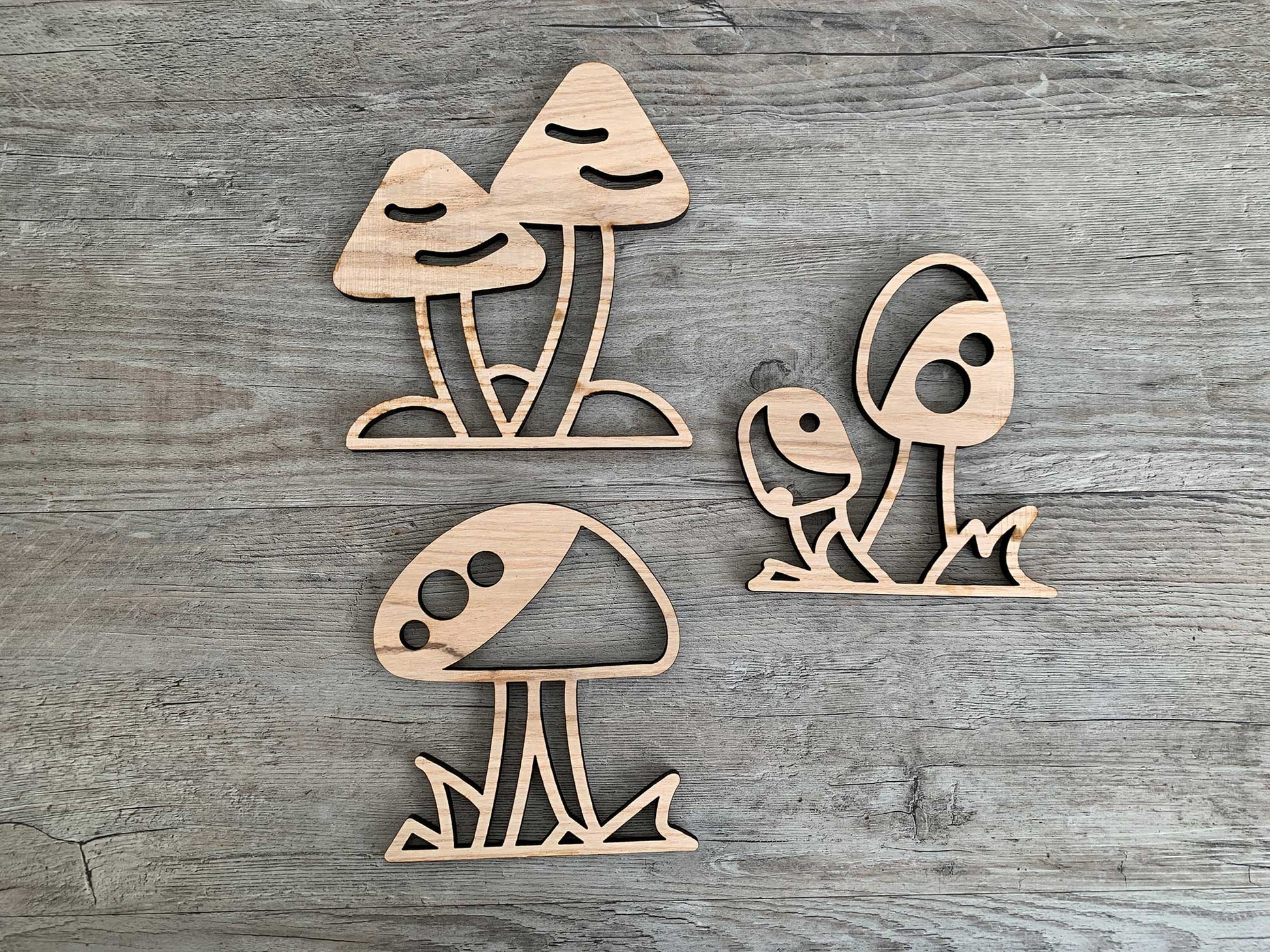 Add a little fun and warmth to your home with this cute mushroom set. The intricate cuts are made with precision by a laser which showcases the natural grain of the wood. The clean lines and simple shapes give it a contemporary feel, making it a perfect addition to any modern decor. Hang them in your living room, bedroom, or nursery to add a unique and stylish touch to your space.