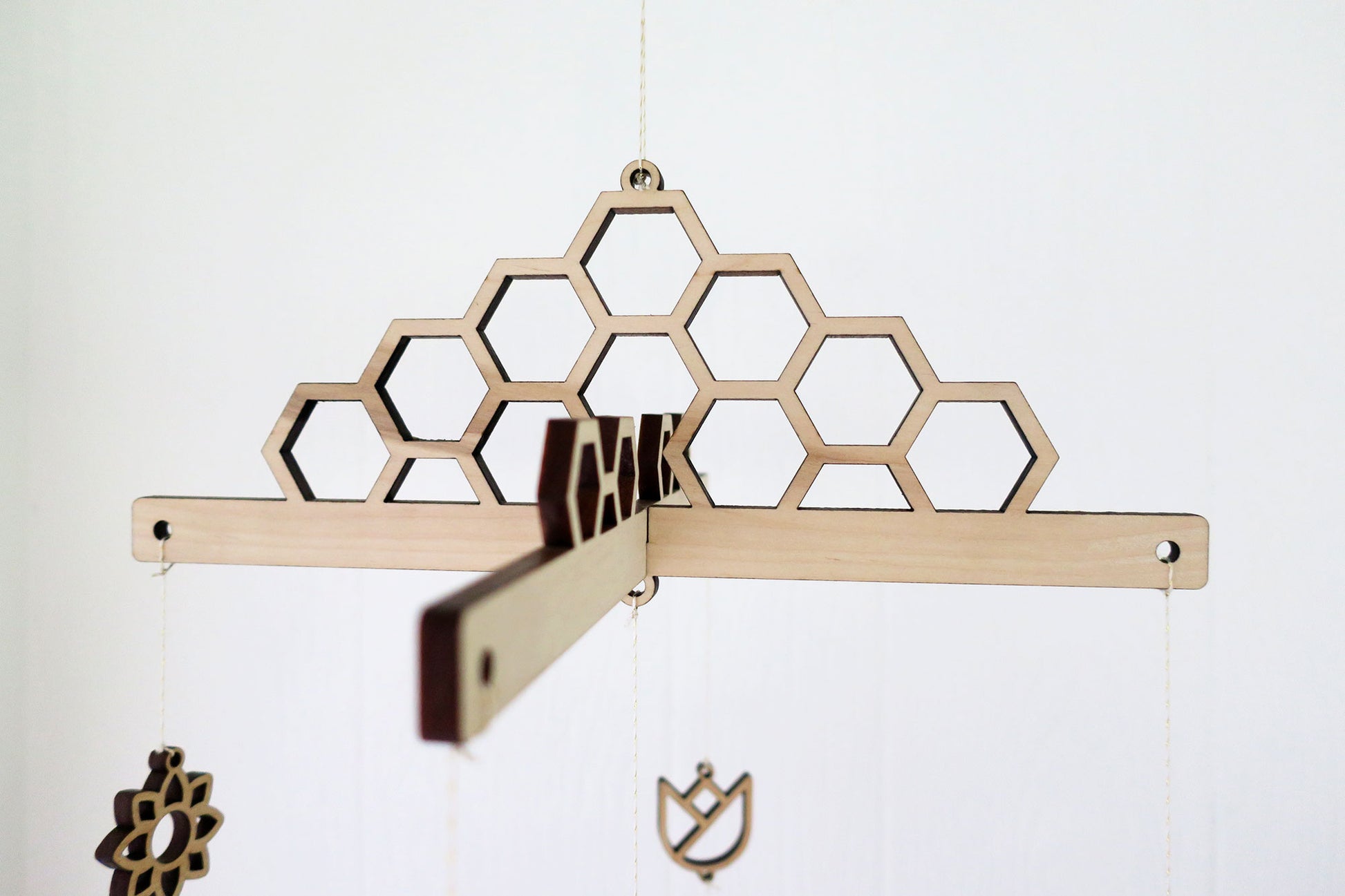 This mobile is crafted from eco-friendly birch wood and can be easily hung from the metal ring which is included.
