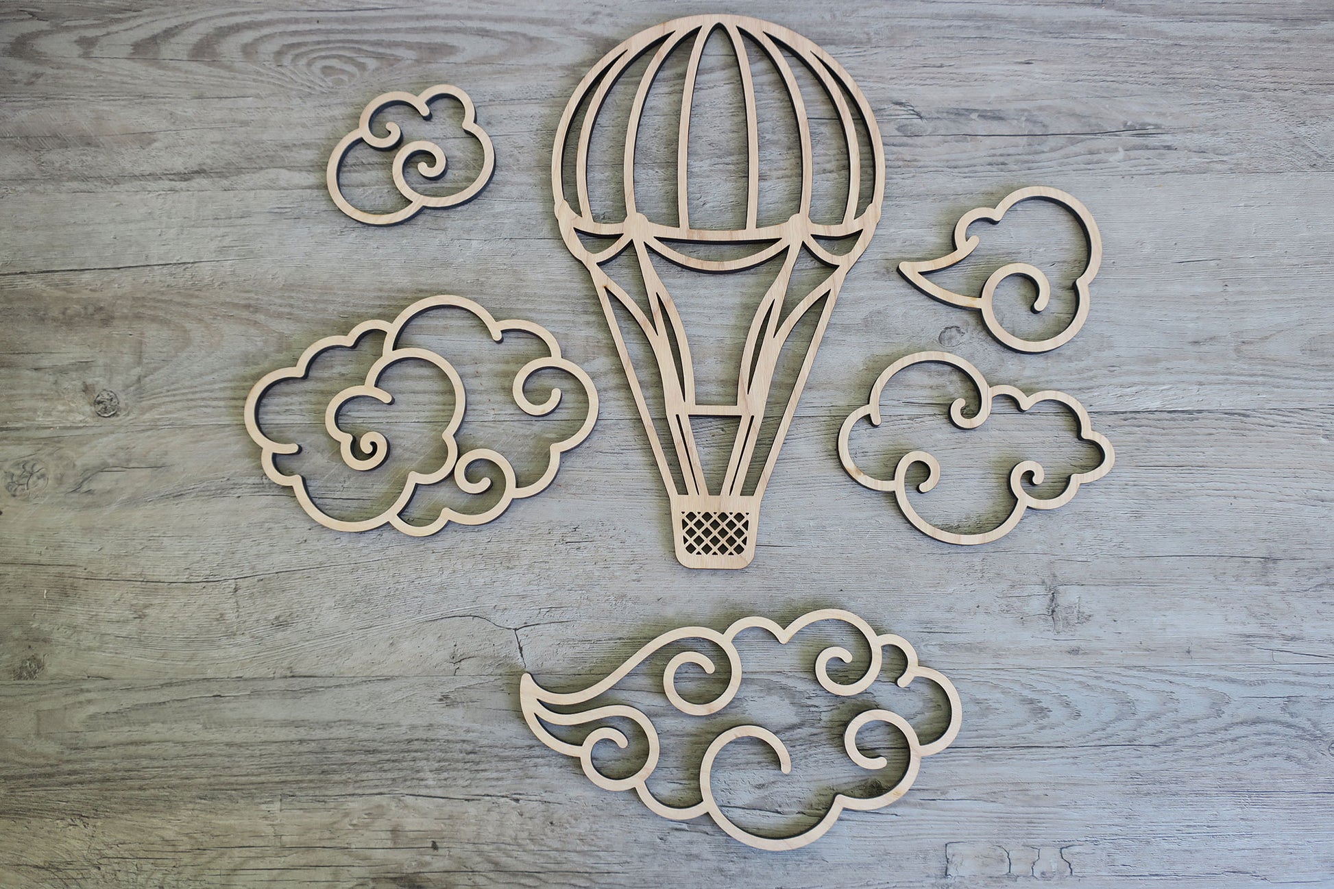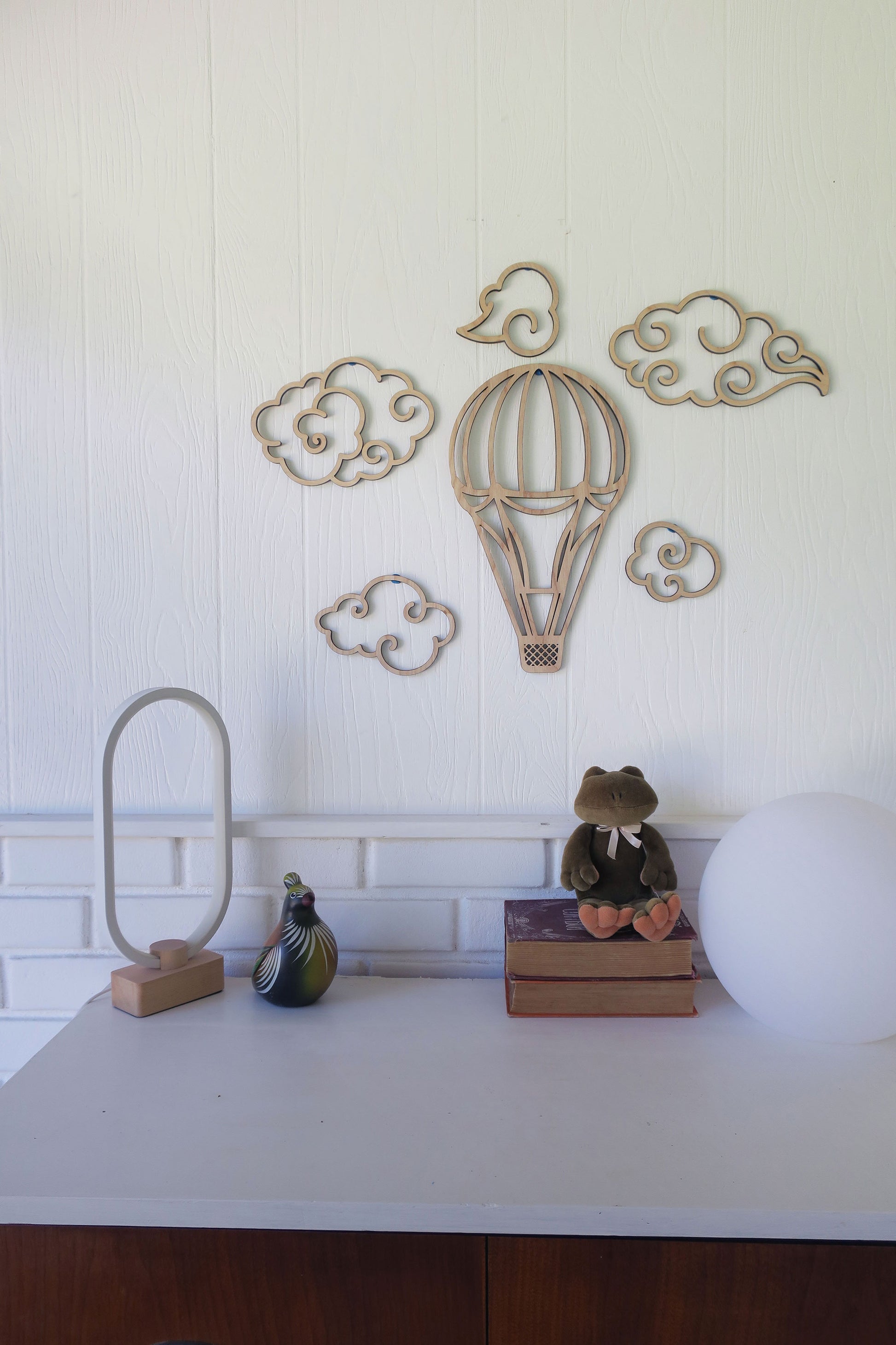 The set includes a variety of cloud shapes and sizes as well as the blimp, allowing you to create a custom arrangement that suits your style and space. Whether you want to adorn a nursery with a cheerful display or add a whimsical accent to a living room or office, our wooden balloon wall decor offers versatility and charm.