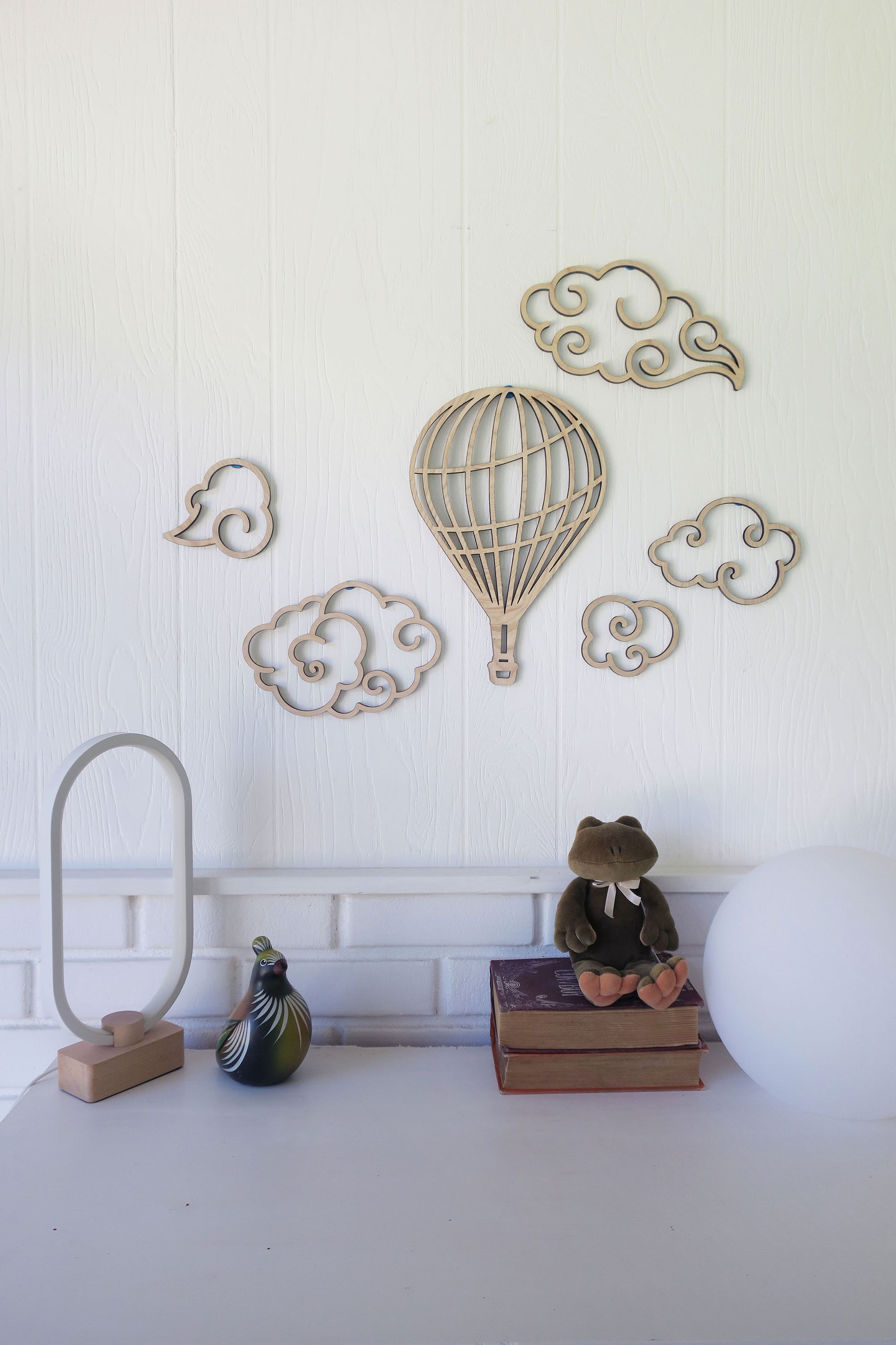 The set includes a variety of cloud shapes and sizes as well as the blimp, allowing you to create a custom arrangement that suits your style and space. Whether you want to adorn a nursery with a cheerful display or add a whimsical accent to a living room or office, our wooden balloon wall decor offers versatility and charm.